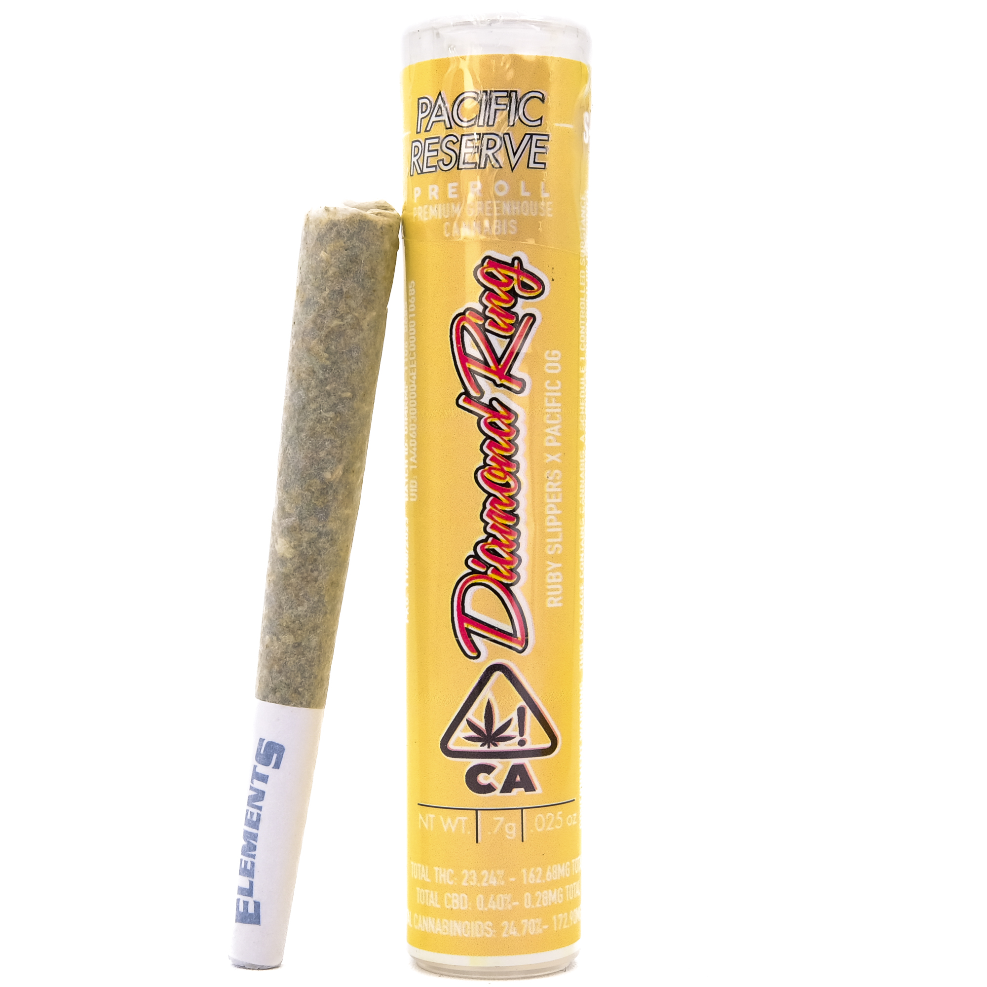 This Diamond Ring .7g Pre-Roll is expertly Dutch rolled using premium flower, delivering quality effects. Crafted with care and rolled with Elements Rice Paper cones, you'll find a smooth, clean, and consistent smoke that showcases the quality and craftsmanship behind every Pacific Reserve™ product.