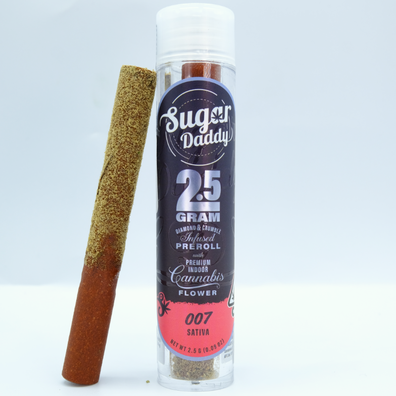 Brought to you by Sugar Daddy. 100% premium indoor flower with a hemp wrap; infused with kief, diamonds, crumble, & live resin; with a 12mm glass tip; all hand rolled.